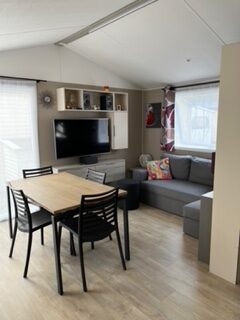 Terrasse couverte et joue côté droite, et salon de jardin (table +4 chaises). Prises de courant extérieures de chaque côté de la terrasse, robinet extérieur. Coffre-gaz, et abris de jardin à l’arrière du mobil-home et sous-bassement en PVC blanc. - Merci de demander la notice d’information au camping pour connaître les modalités du contrat et du cahier des charges.