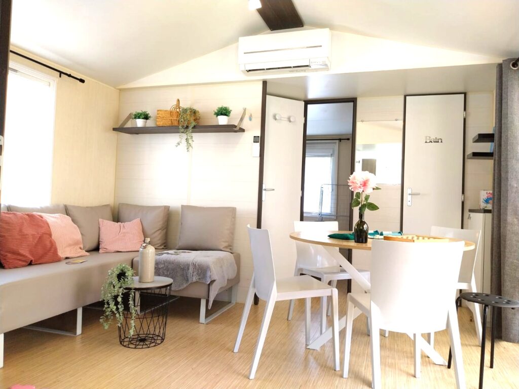 Ce mobil-home, conçu pour accueillir jusqu’à cinq personnes, est une véritable invitation à la sérénité et aux moments de partage en famille.